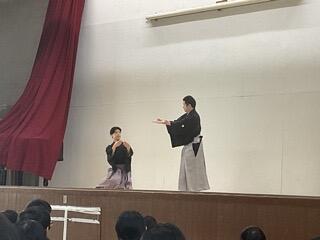 育友会の学年活動で日本舞踊の講演会を実施しました。講師の先生をお招きし、日本舞踊の基本的な作法や姿勢、所作について分かりやすく教えていただきました。