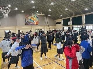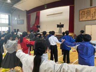 学びのまとめとして、YOASOBIの「群青」の曲に合わせて、学年全体で日本舞踊を体験しました。現代的な音楽と日本の伝統文化が融合した舞に、生徒たちは楽しみながらも真剣に取り組み、日本文化の奥深さを体感する貴重な時間となりました。