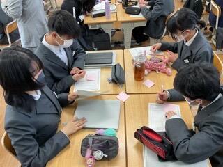 授業では「KJ法」を取り入れ、感じたことや気付いたことを付箋に書き出し、模造紙に広げたり仲間分けをしたりしながら、考えを整理していきました。